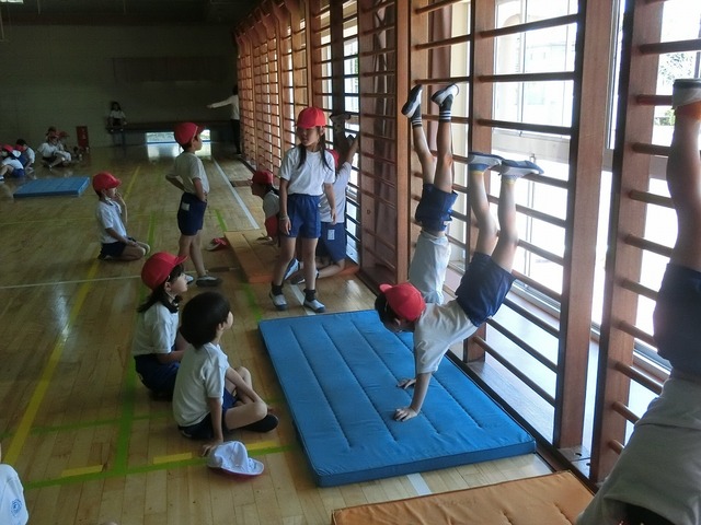 ろくぼく逆立ちに挑戦する金谷っ子たち