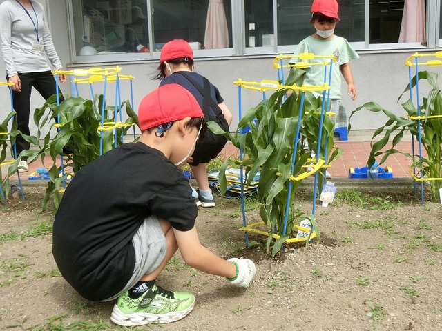 2年生の金谷っ子がそれぞれ植えた野菜のお世話をしています。