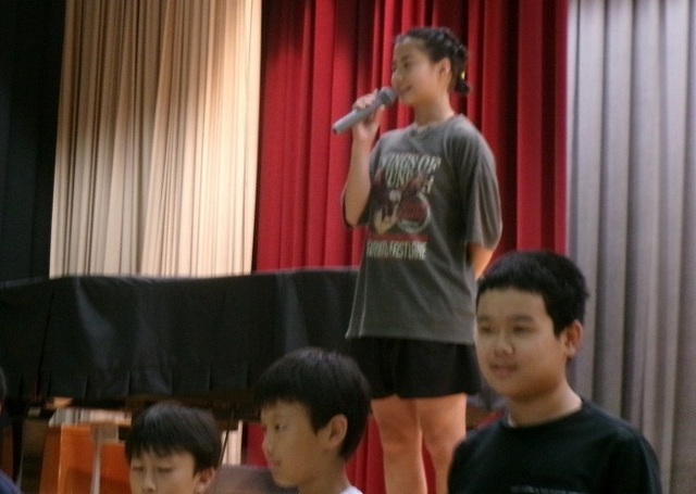運営委員の金谷っ子は、場所を体育館に変更したことを校内放送でお知らせします。